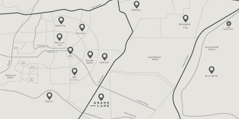 The Sixth Settlement is one of the best locations for real estate investment in New Cairo. Therefore, HDP Developments chose it for Grand Lane Compound. Moreover, the area supports comfortable residential living with calm surroundings and strong infrastructure. At the same time, residents stay connected to many key destinations across New Cairo. As a result, major roads and important hubs surround the compound, ensuring easy movement and long-term investment value. Some of the nearby places are the following: