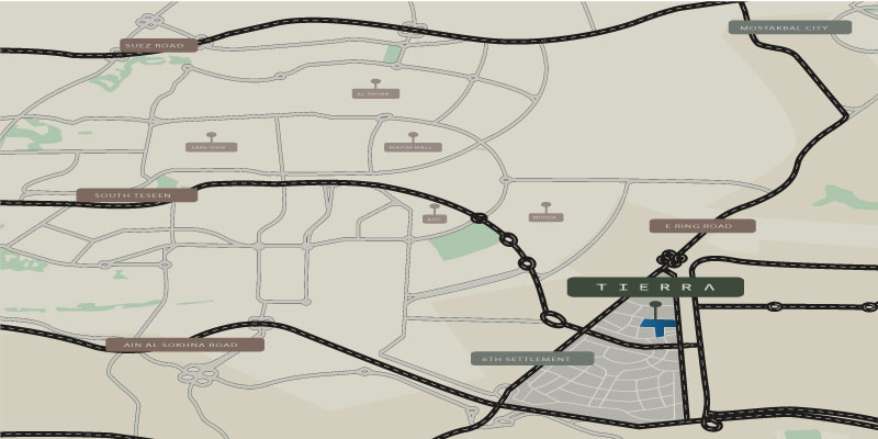 The prime location is one of the main aspects clients are looking for while choosing their future home, so SED Company made sure to lay the foundation of Tierra Compound at the heart of the 6th Settlement, as well as it is an easy destination to be reached from different places, especially the following:
